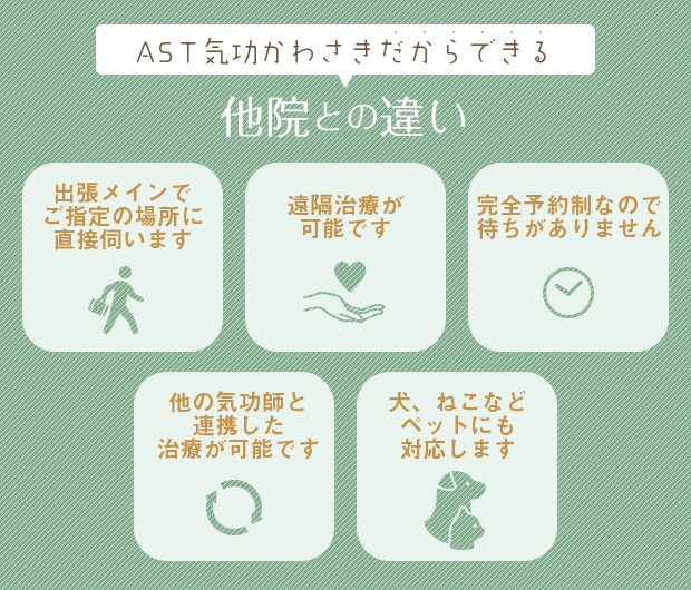 そんな中、身内の病気を機にAST気功治療と出会うことになり、まさに見えないけど大切なことの実践を通して人のお役に立てる と考え協会での修練、実践を経て、開業に至ることになりました。